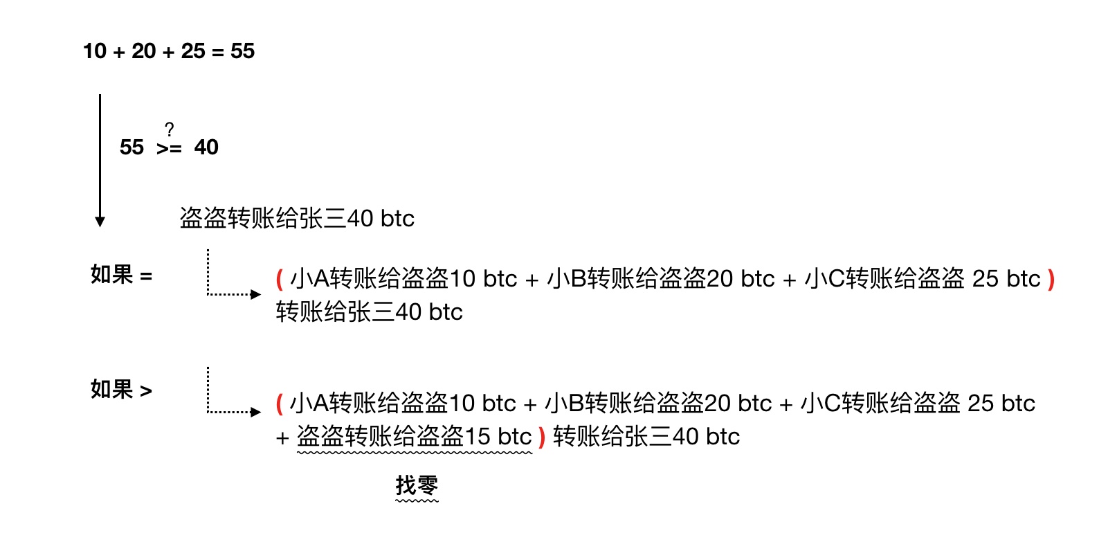 就上图例子来说,我们最后合并成的交易记录 “( 小A转账给盗盗10 btc + 小B转账给盗盗20 btc + 小C转账给盗盗 25 btc + 盗盗转账给盗盗15 btc ) 转账给张三40 btc ” 事实上等同于“盗盗转账给张三40 btc”。其中“盗盗转账给盗盗15 btc”就可以理解找零。