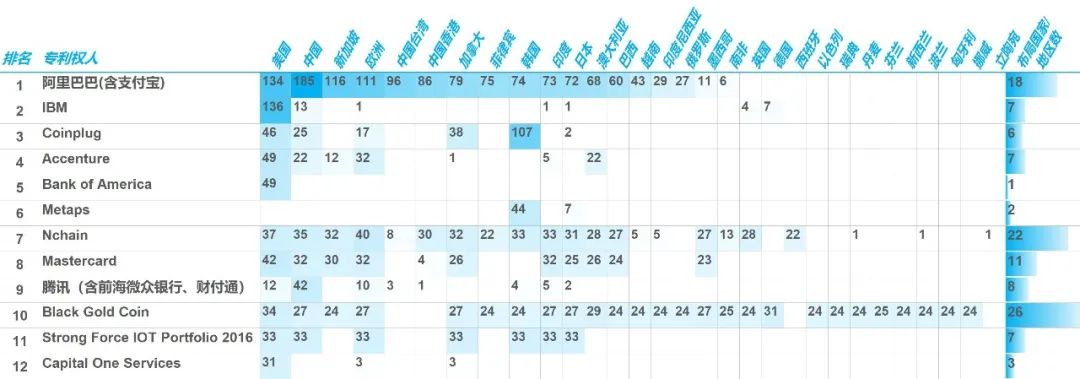 第一梯队和第二梯队的专利权人中,有2家中国企业——阿里巴巴(支付宝)和腾讯,2家韩国企业Coinplug和Metaps,1家英国企业Nchain,其余均为美国企业。